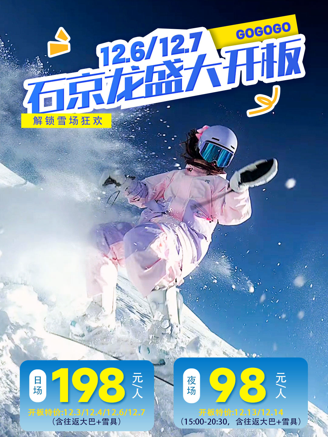 2)雪票:石京龙全天滑雪票(包含雪板、雪鞋、雪仗、魔毯、缆车,雪道全天不限时,雪道等开放情况以景区实际为准);