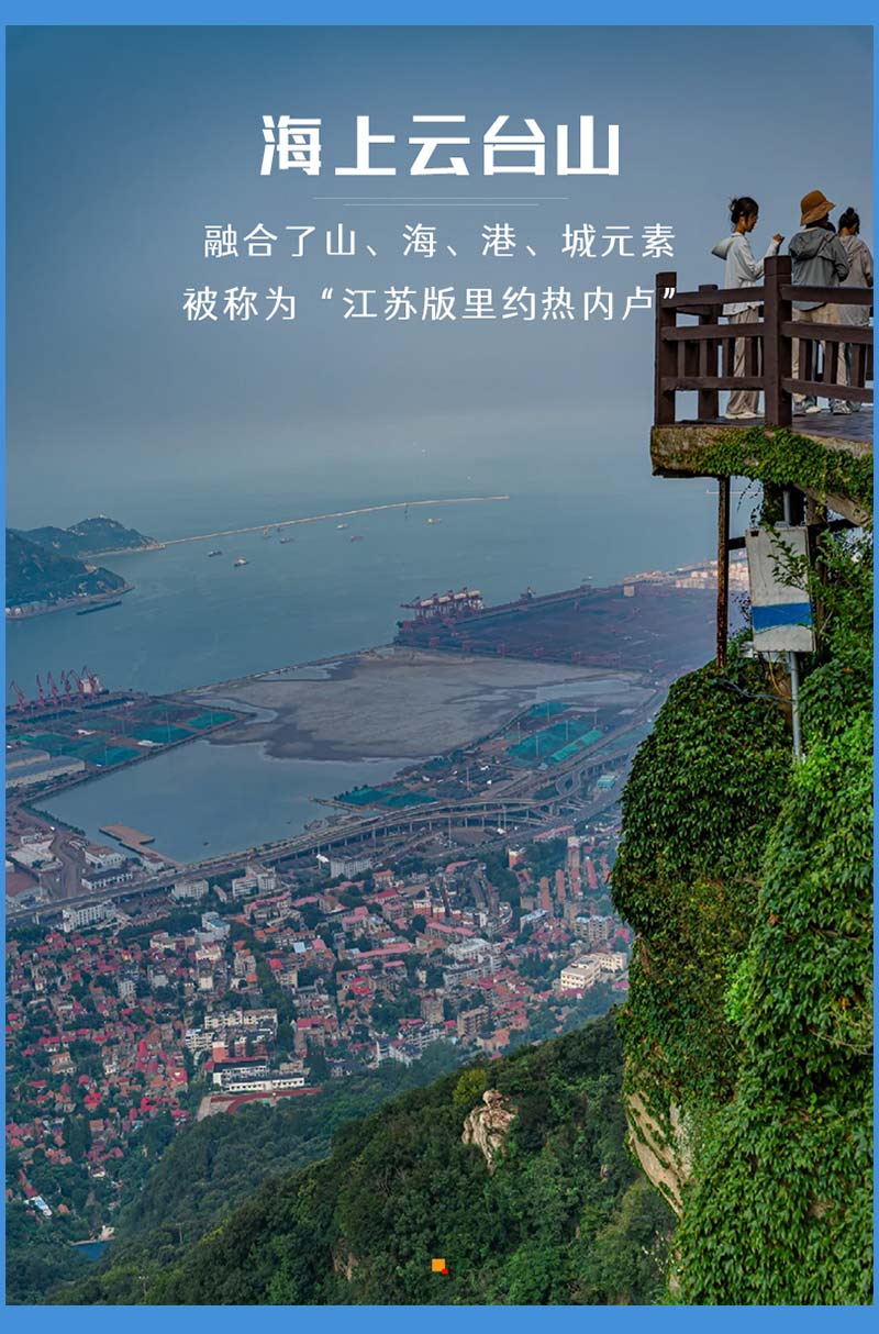 - 早餐后前往海上云台山游览,这里融合了山、海、港、城元素,被称为“江苏版里约热内卢”。
