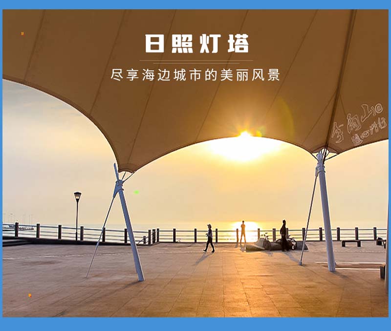 日照灯塔由灯塔广场、观石广场、观涛广场组成。 沿海地段以灯塔、自然礁石群为主题,整合了护岸、木栈道、硬质铺装等带状景观,并将大面积的绿化和水、石、亭等点状、带状景观有机组合,加之夜晚繁星般的灯火和白色张拉膜的映衬,使此地无不显示日月同辉的景观。