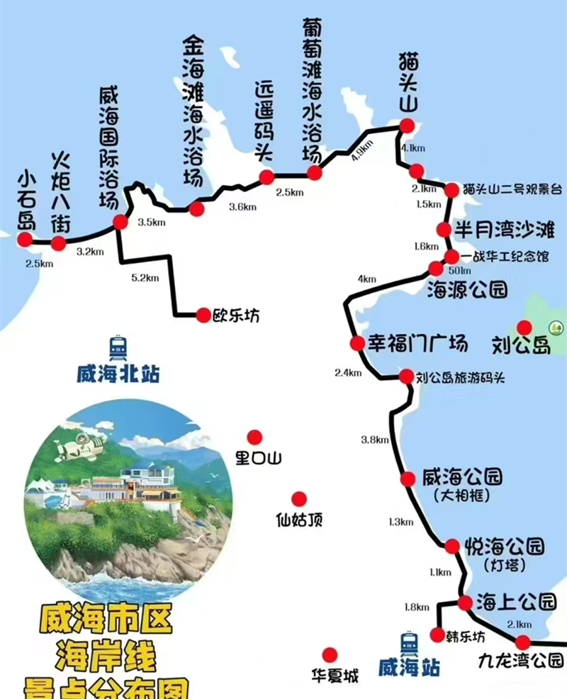 - 早起继续出发前往威海,抵达威海后我们先去酒店办理入住。之后可以结伴品尝威海美食,自由游览威海最美海岸线(可以打卡火炬八街、幸福门、威海之窗等网红景点;还可以游览威海公园、悦海公园、海源公园、海上公园等海岸线公园;傍晚可在小石岛欣赏日落;晚上可以自由前往韩乐坊/欧乐坊夜市品尝美食小吃,还可以前往威海之窗、幸福门等地欣赏夜景)。
