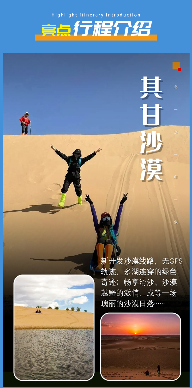 - 早餐后我们前往沙漠轻徒步。此线路非景区线路,徒步穿越沙漠活动,畅享滑沙、沙漠越野的激情,或静坐沙丘,等一场瑰丽的沙漠日落。用脚丈量沙漠,用心行走天际,感受沙漠与众不同的美,体验生命的更多精彩的过程。其甘,蒙语意为“酸马奶”。相传康熙皇帝巡游至此,饥渴难耐,喝了当地牧民敬奉的酸马奶后,身体顿时感觉轻松,于是就赐此地为其甘了。