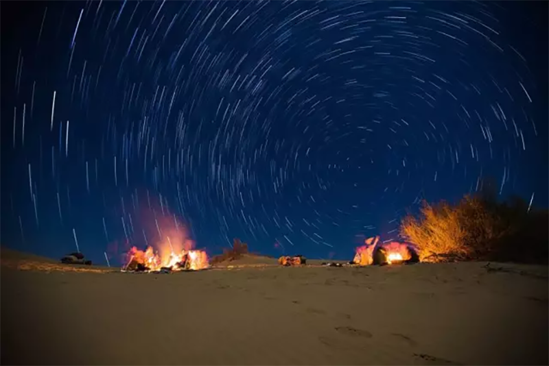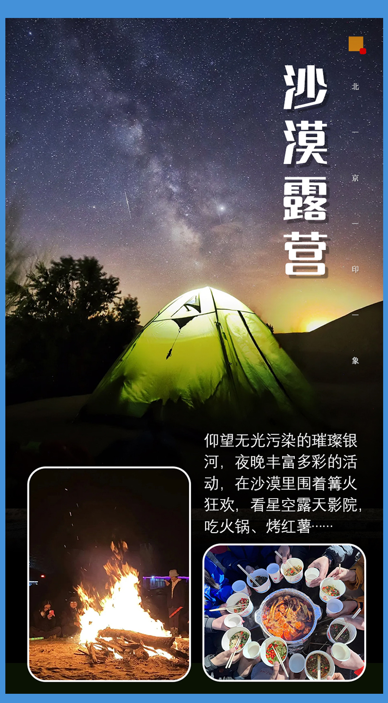 夜宿在沙漠腹地,我们有丰富多彩的活动,围坐篝火旁你会认识好多新的同伴。在沙漠里一起载歌载舞,围着篝火狂欢,聆听马头琴声悠扬。看沙漠星空露天影院,吃烤红薯、火锅、拉面……仰望无光污染的璀璨银河,用镜头捕捉流星划破深邃夜空。