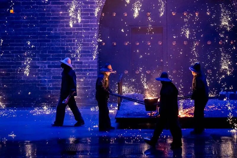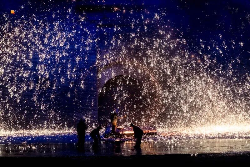 当一勺勺铁水化作千朵万朵火花,从夜空中飘飘洒洒、缓缓落下时,它给观众带来的既有瞬间感官上的刺激,更有心灵深处的震撼。将数百公斤重的生铁用炼炉烧化成铁水,再用特制的勺子舀起,均匀地洒向天空,火红的铁水化作条条丝线,纷纷扬扬洒落下来,铺天盖地,其壮观、其璀璨,在中国成百上千灯节风俗中,独一无二。