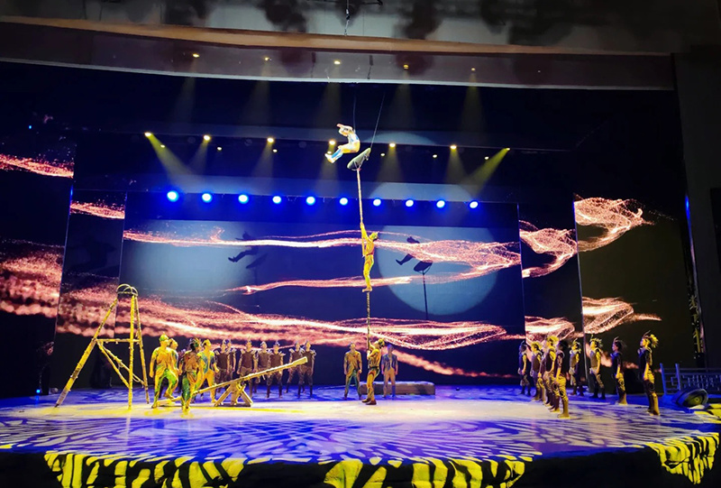 漫步城中可以尽情欣赏各具特色的杂技、马戏、戏法、气功、曲艺、独台戏、拉洋片、驯白鼠等艺术表演,身着清朝服饰的吴桥艺人们,说着当年卖艺求生的语言,把过去艺人四海为家的生活情景展视的淋漓尽致,我们在露天的杂技表演广场,看驯鼠、独台戏、驯猴、吹破天剧场的吹茶壶、鼻吹唢呐和口吃香烟、上刀山、吞剑、等,之后在魔术宫剧场、鬼手剧场和红牡丹剧场看室内表演,以及国术马戏场。