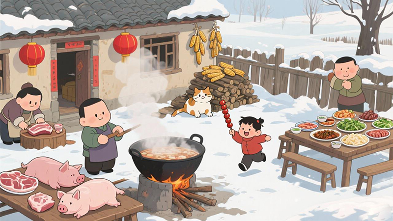 3)活动:一起欣赏杀猪、刨猪等活动,还可以参与烹饪杀猪菜;